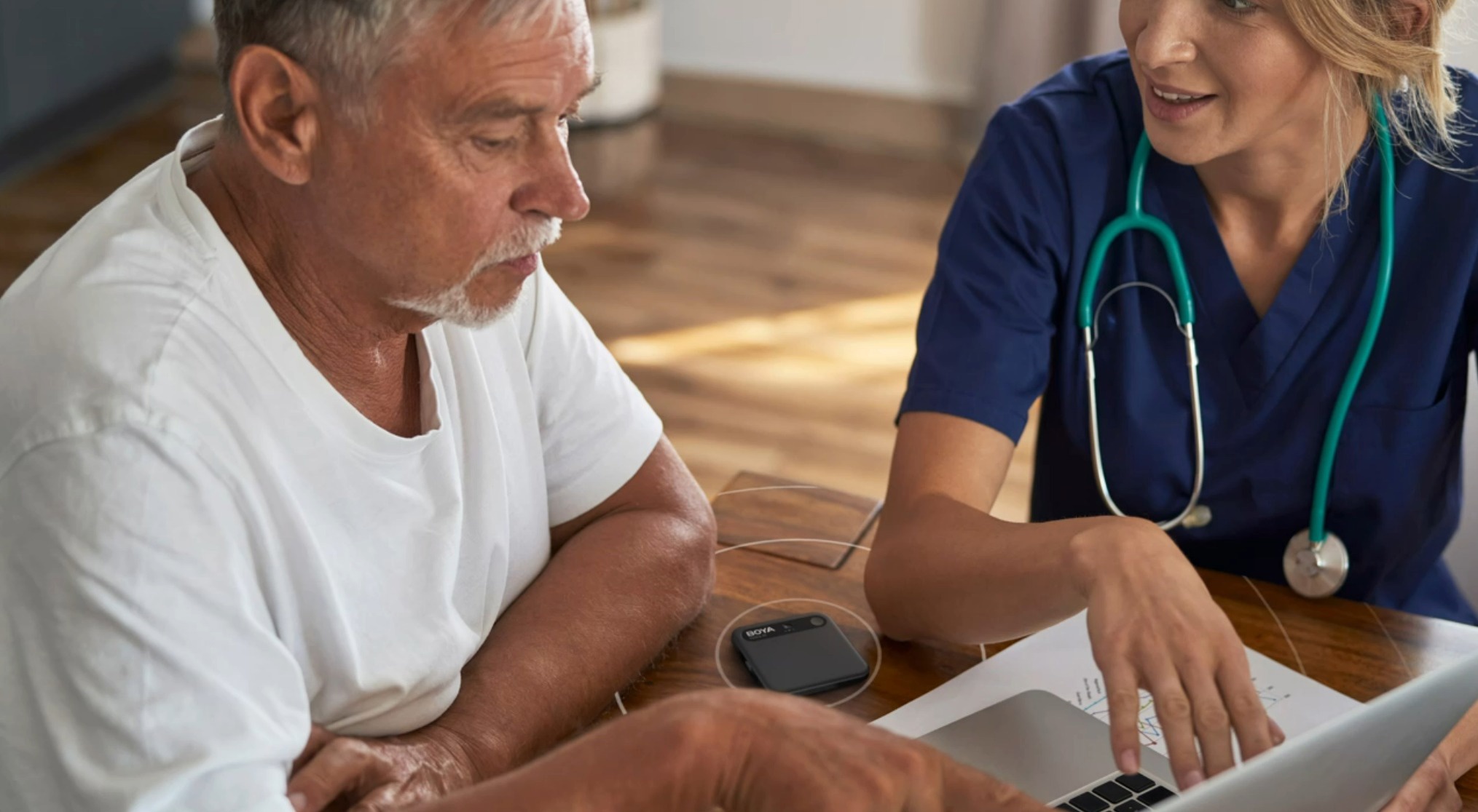 Toto je asi najväčší ťahák Boya Notry. Prístroj disponuje tromi režimami nahrávania, ktoré sa prepínajú fyzickým posuvníkom na tele – žiadne lovenie v menu, jednoducho posuniete a idete. Prvý režim, ambientné nahrávanie, je klasika pre meetingy, prednášky alebo rozhovory. Dva MEMS mikrofóny zabezpečujú 360 ° všesmerové snímanie s dosahom až 10 metrov, čo znamená, že aj keď sedíte v zadnom rade prednáškovej sály, Notra by mala zachytiť rečníka. Boya navyše pridáva vlastné AI potlačenie šumu, ktoré sľubuje redukciu až 30 dB – typicky teda zvuky klávesníc, klimatizácie alebo šum v kaviarni.