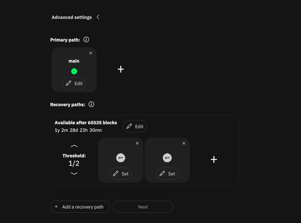 Nunchuk využíva ako časový zámok kľúč platformy, nie relatívný time-lock. Tým pádom si môžete nastaviť (a ľubovoľne meniť) čas, kedy je možné použiť kľúč dediča. Technicky ide o multisig 2 zo 4. Jeden kľúč má dedič (resp. ho vie získať od platformy na základe kódu dedičstva a hesla), jeden platforma a dva kľúče má majiteľ peňaženky. V praxi vaše kľúče môžu byť buď softvérové alebo hardvérové, respektíve ich kombinácia.